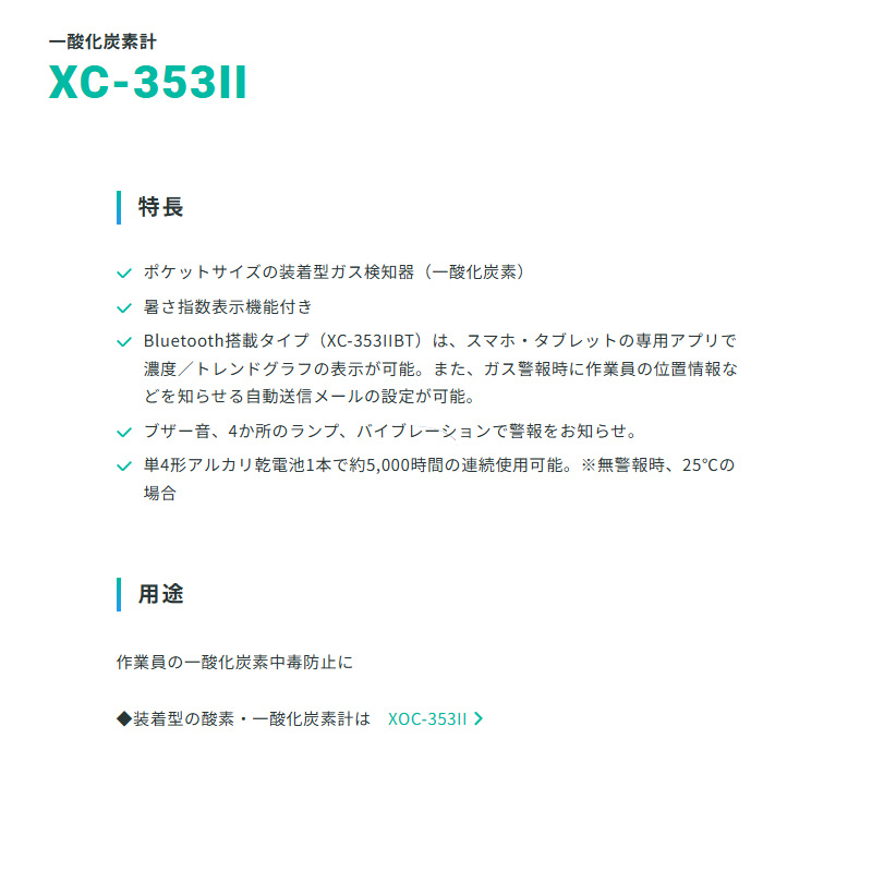 セール 前の商品 次の商品 新コスモス電機 XC-353II装着型一酸化炭素計 XC-353II対象ガス:CO ¥51,700 元の価格は ¥51,700 でした。¥48,008現在の価格は ¥48,008 です。 円(税込) 残り在庫1個 新コスモス電機 XC-353II装着型一酸化炭素計 XC-353II対象ガス:CO個 購入する 商品コード: cosmos-064cosmos-064 カテゴリー: ガス検知器 ブランド: 新コスモス電機 説明 レビュー (0) 説明 標準付属品 単4形アルカリ乾電池1本 安全ピンアダプタ1個(取付ねじ付) レビュー レビューはまだありません。 以前にこの商品を購入したことのあるログイン済みのユーザーのみレビューを残すことができます。 関連商品 クイックビュー セール クイックビュー ガス検知器新コスモス電機 XP-302M-R-A-3マルチ型ガス検知器 XP-302M-R-A-3.対象ガス:O2、イソブタン、H2S、CO(8mガス導入管、アルミケース) ¥289,300 元の価格は ¥289,300 でした。¥264,307現在の価格は ¥264,307 です。 円(税込) カートに入れる クイックビュー セール クイックビュー ガス検知器新コスモス電機 XP-302M-R-A-1マルチ型ガス検知器 XP-302M-R-A-1対象ガス:O2、メタン、H2S、CO(1mガス導入管(ドレンフィルタ付き)、レザーケース) ¥223,300 元の価格は ¥223,300 でした。¥204,224現在の価格は ¥204,224 です。 円(税込) カートに入れる クイックビュー セール クイックビュー ガス検知器新コスモス電機 XP-302M-R-A-4マルチ型ガス検知器 XP-302M-R-A-4対象ガス:O2、メタン、H2S、CO(巻取リール型8mガス導入管、アルミケース) ¥323,400 元の価格は ¥323,400 でした。¥295,350現在の価格は ¥295,350 です。 円(税込) カートに入れる